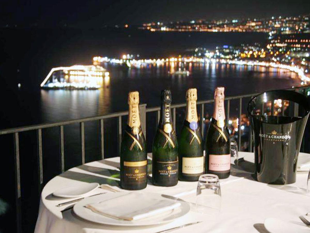 con una bottiglia di vodka GreyGoose 70cl + 1 prosecco Martini, RedBull, lemon e frutta ogni 5 persone; oppure in alternativa 1 bottiglia di Champagne a scelta tra Veuve Cliquot / Moet Chandon.